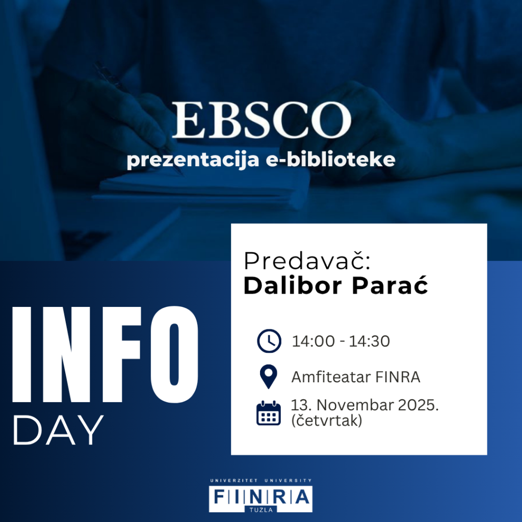 Dana 13. novembra 2025. godine, u amfiteatru Univerziteta FINRA Tuzla, biti će održana prezentacija EBSCO baze podataka za studente prve godine.
